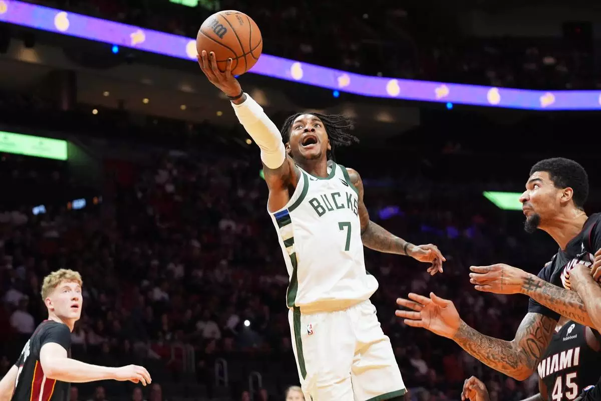 Milwaukee Bucks guard Kevin Porter Jr. (7) drives to the basket during the first half of an NBA basketball game against the Miami Heat Thursday, March 12, 2026, in Miami. (AP Photo/Marta Lavandier)