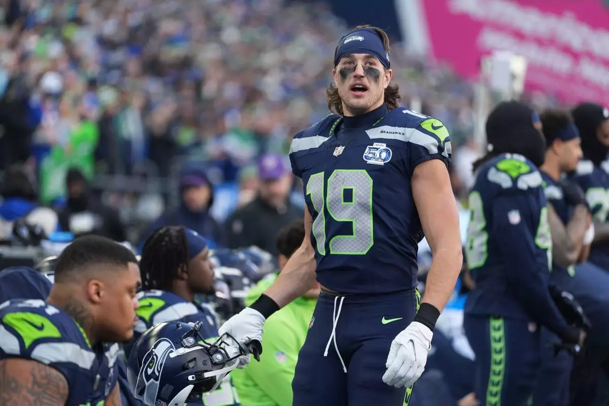 FILE - Seattle Seahawks wide receiver Jake Bobo (19) looks on from the bench before a NFC Championship NFL football game against the Los Angeles Rams, Jan. 25, 2026, in Seattle. (AP Photo/Lindsey Wasson, File)