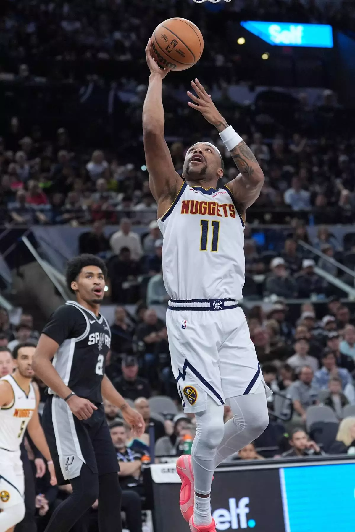 Denver Nuggets guard Bruce Brown (11) drives to the basket against the San Antonio Spurs during the first half of an NBA basketball game in San Antonio, Thursday, March 12, 2026. (AP Photo/Eric Gay)