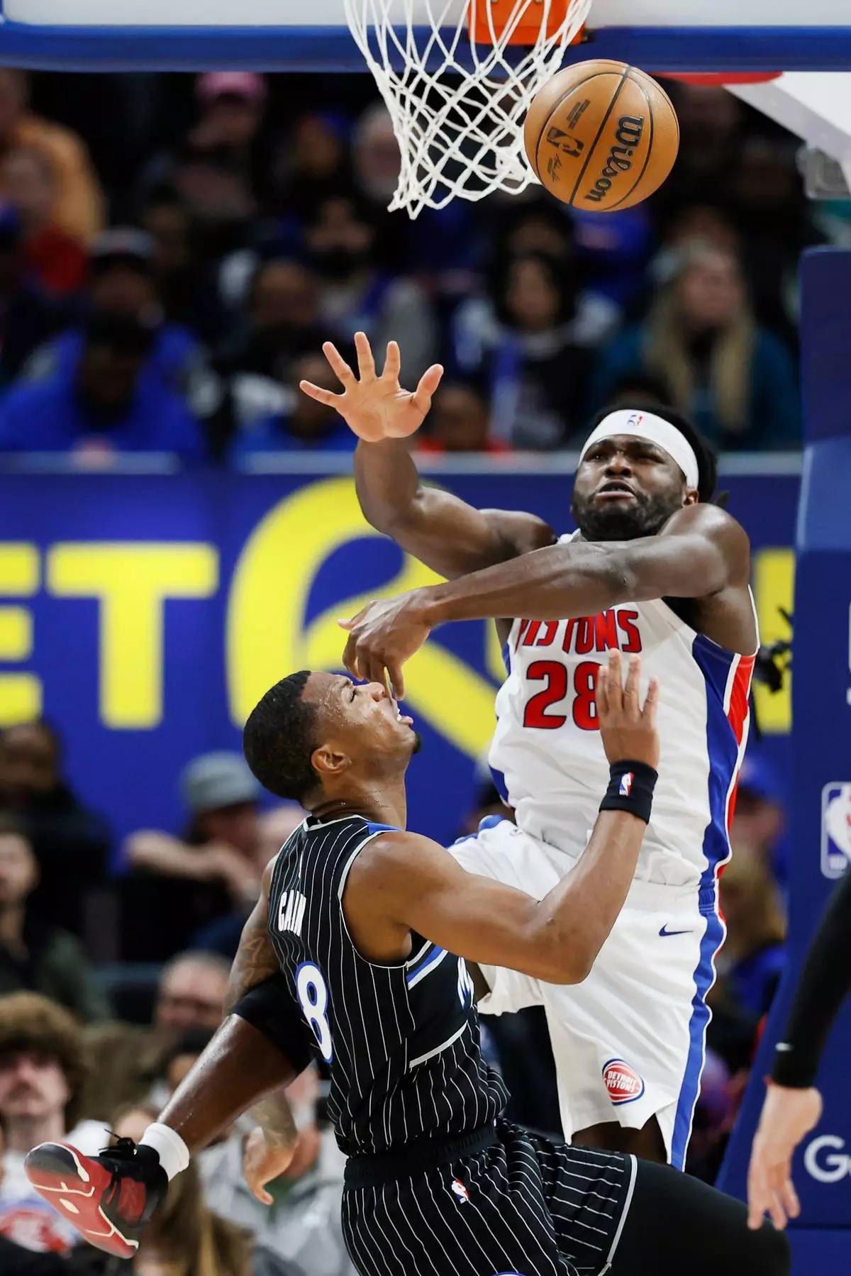 Detroit Pistons forward Isaiah Stewart (28) rejects a shot by Orlando Magic forward Jamal Cain (8) during the first half in Game 5 of a first-round NBA basketball playoffs series Wednesday, April 29, 2026, in Detroit. (AP Photo/Duane Burleson)
