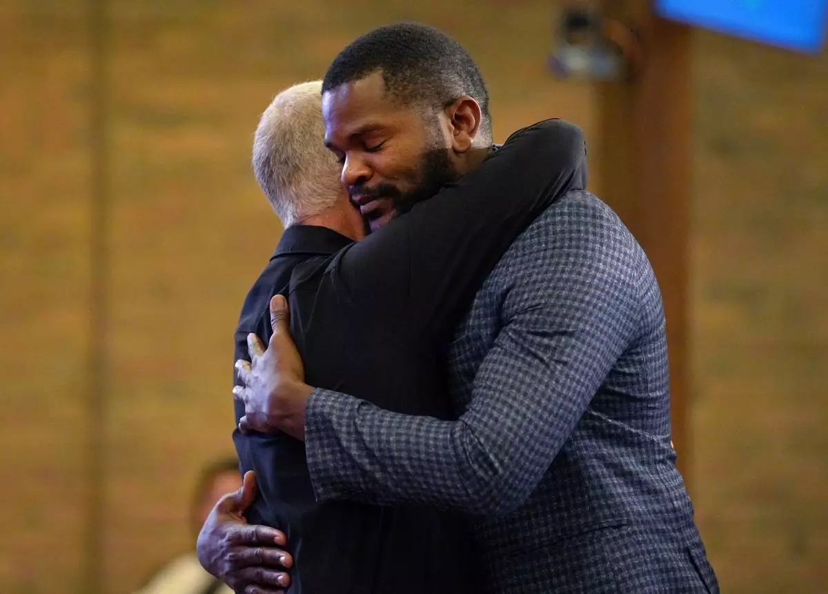 FILE - Carl Ruby, pastor at Central Christian Church, hugs Lindsay Aime during service, on Sept. 15, 2024, in Springfield, Ohio. (AP Photo/Jessie Wardarski)