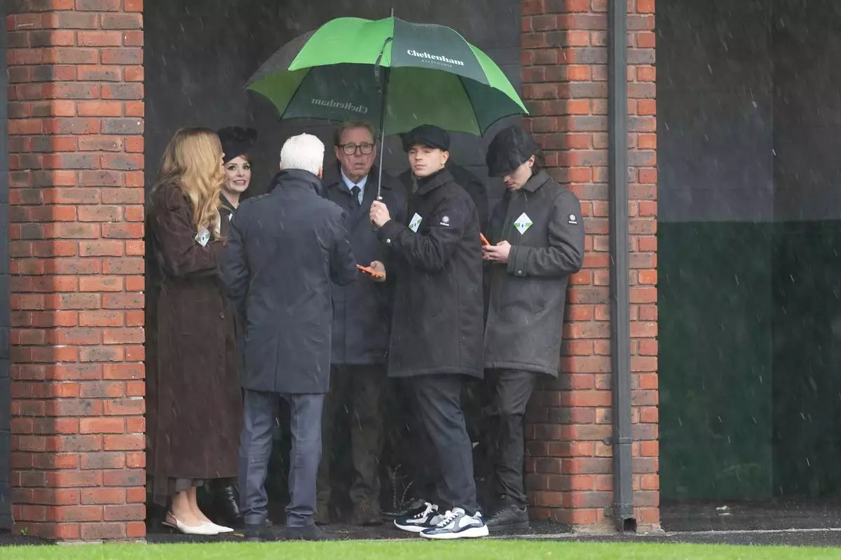 Former soccer manager Harry Redknapp, center shellers with friends and family from the rain on day four of the 2026 Cheltenham Festival in Cheltenham, England, Friday, March 13, 2026. (AP Photo/Dave Shopland)