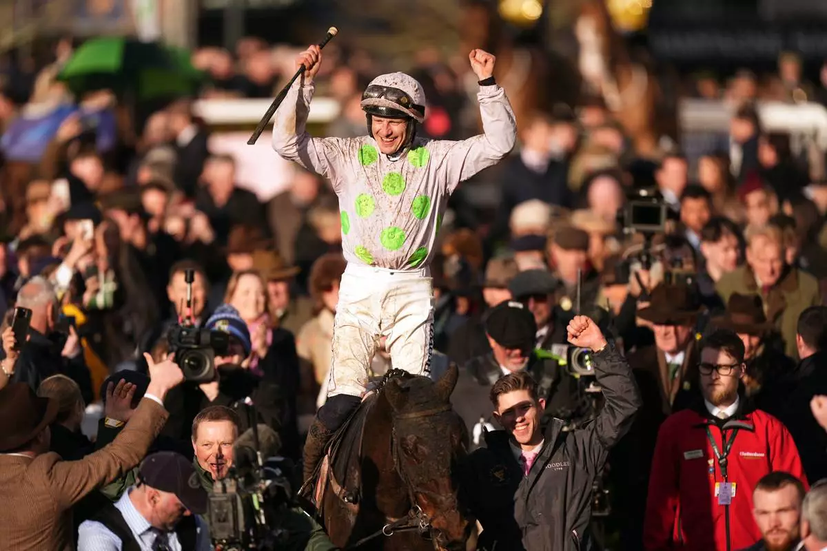 Paul Townend aboard Gaelic Warrior after winning the Cheltenham Gold Cup Chase on day four of the 2026 Cheltenham Festival at Cheltenham Racecourse, England, Friday March 13, 2026. (Mike Egerton/PA via AP)