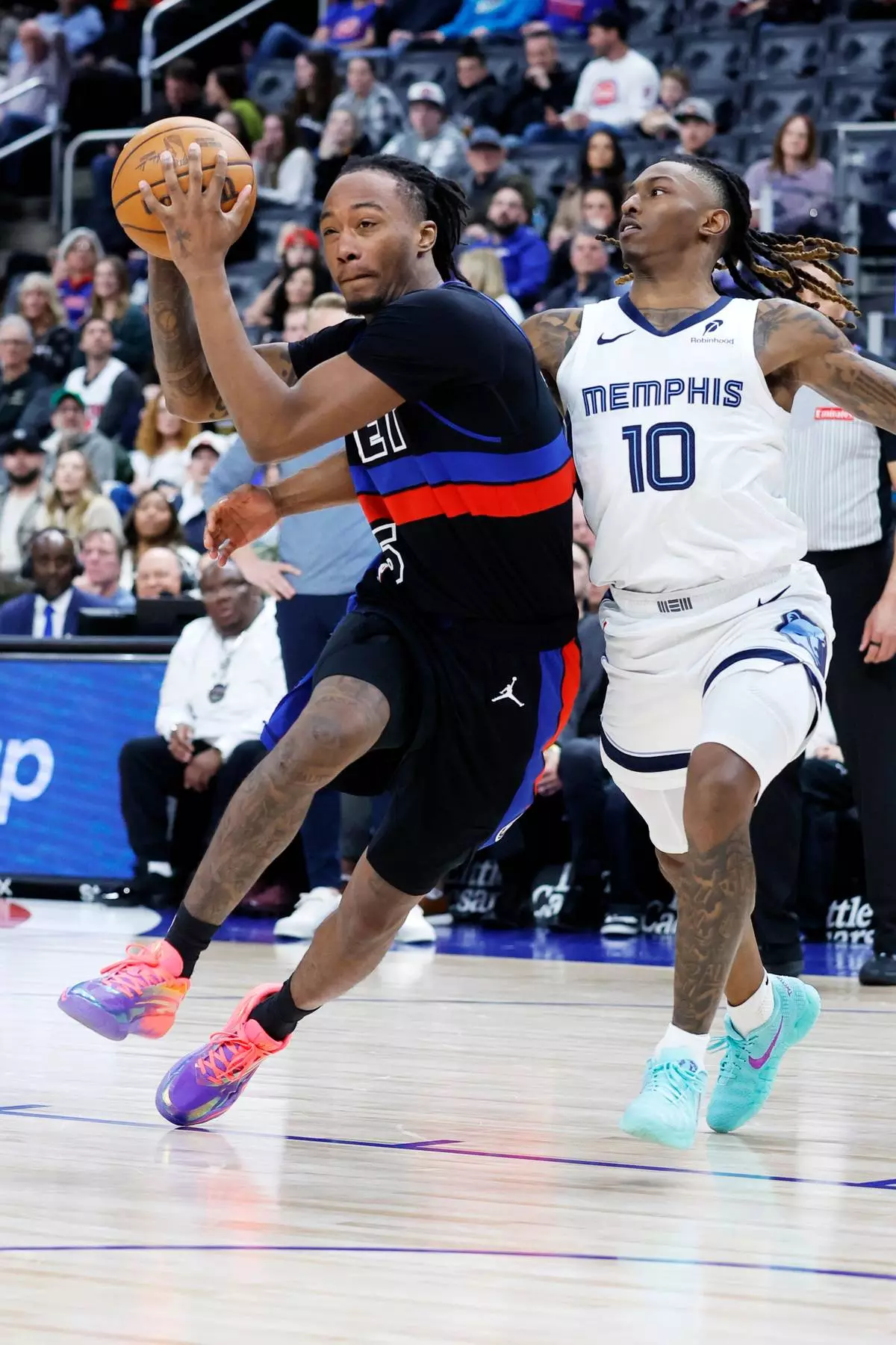 Detroit Pistons center Jalen Duren, center, drives to the basket against Memphis Grizzlies guards DeJon Jarreau (77) and Jahmai Mashack, right, during the second half of an NBA basketball game Friday, March 13, 2026, in Detroit. (AP Photo/Duane Burleson)