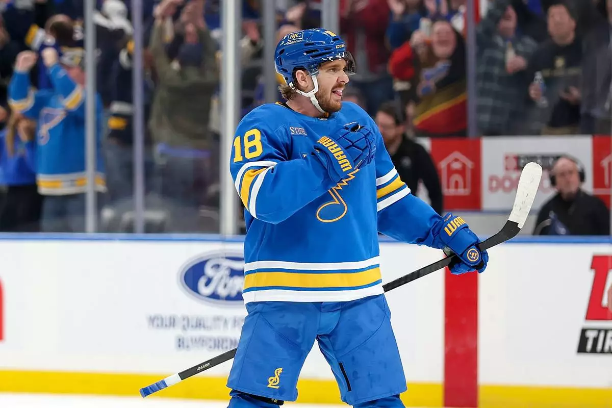 St. Louis Blues' Robert Thomas (18) reacts after scoring during the overtime period of an NHL hockey game against the Edmonton Oilers Friday, March 13, 2026, in St. Louis. (AP Photo/Scott Kane)