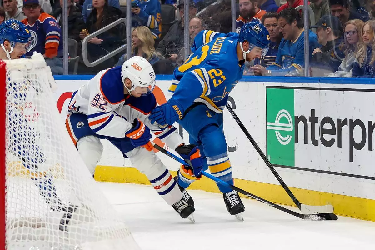St. Louis Blues' Logan Mailloux (23) and Edmonton Oilers' Vasily Podkolzin (92) battle for control of the puckduring the first period of an NHL hockey game Friday, March 13, 2026, in St. Louis. (AP Photo/Scott Kane)