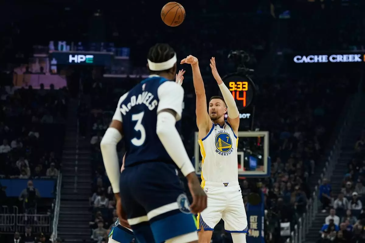 Golden State Warriors center Kristaps Porzingis (7) shoots a 3-point basket against the Minnesota Timberwolves during the first half of an NBA basketball game Friday, March 13, 2026, in San Francisco. (AP Photo/Godofredo A. Vásquez)