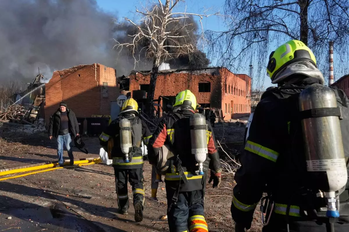 Firefighters approach the damaged railway workshops following a Russia missile and drone attack, in Brovary close to Kyiv, Ukraine, Saturday, March 14, 2026. (AP Photo/Efrem Lukatsky)