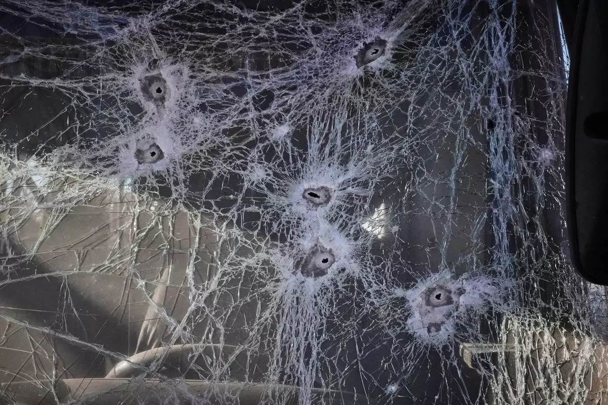 Shrapnel holes cover the glass of a damaged bus near railway workshops, following a Russia missile and drone attack, in Brovary close to Kyiv, Ukraine, Saturday, March 14, 2026. (AP Photo/Efrem Lukatsky)