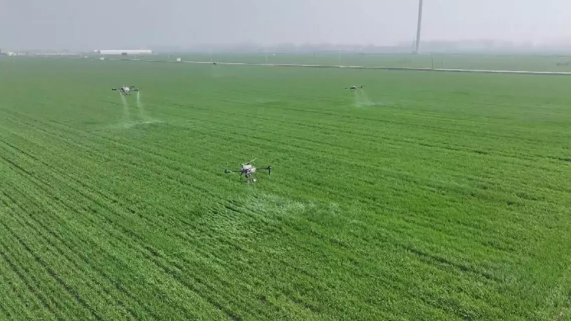 Many farmers in Xiwang Village of Luohe City now become skilled drone pilots. Multiple drones were used for spraying fertilizer and pesticides.