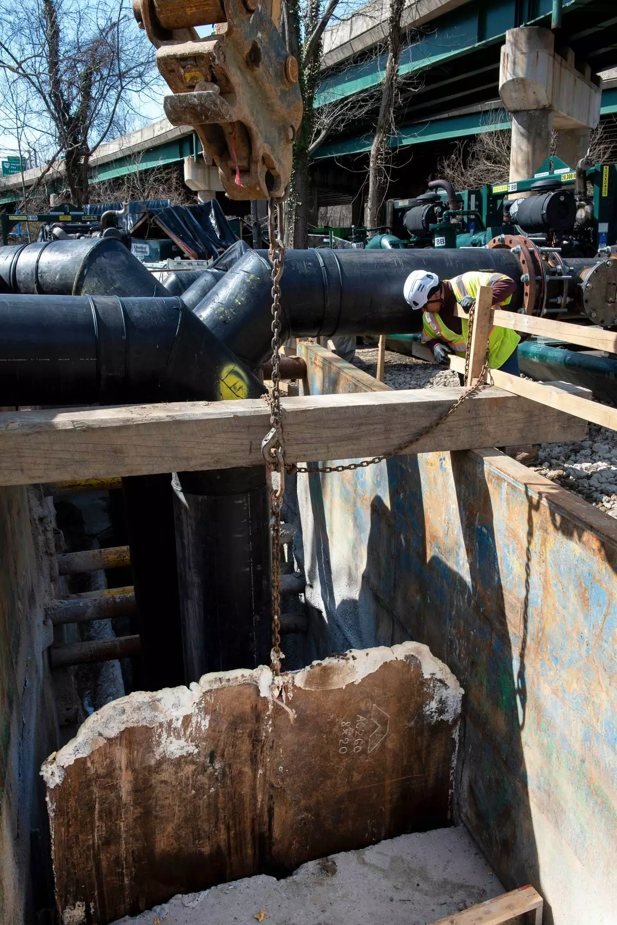 A worker keeps watch as a gate is raised to allow raw sewage to flow to an interceptor pipe along the C&O Canal, beside the Potomac River, in Cabin John, Md., Saturday, March 14, 2026. (AP Photo/Cliff Owen)