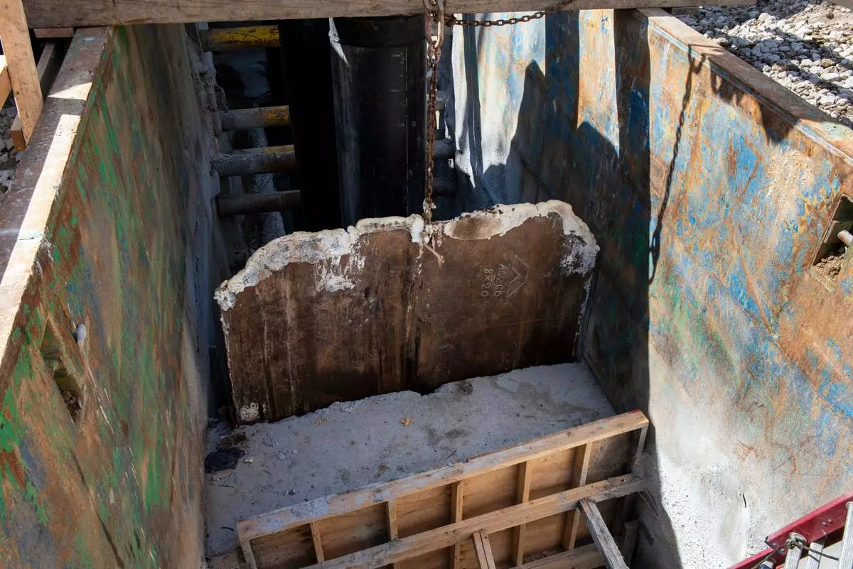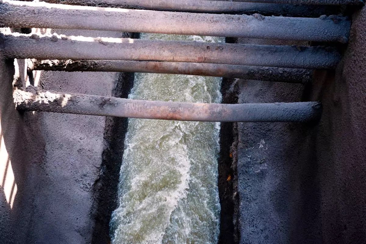 A gate is raised, allowing raw sewage to flow to an interceptor pipe along the C&O Canal, beside the Potomac River, in Cabin John, Md., Saturday, March 14, 2026. (AP Photo/Cliff Owen)