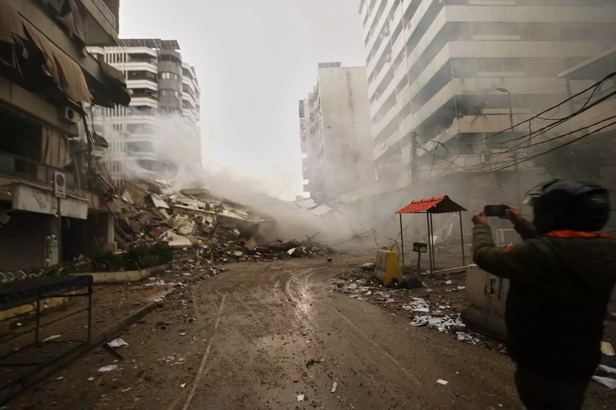 A man photographs the rubble of buildings destroyed in an Israeli airstrike in Dahiyeh, Beirut's southern suburbs, Lebanon, Sunday, March 15, 2026. (AP Photo/Hassan Ammar)