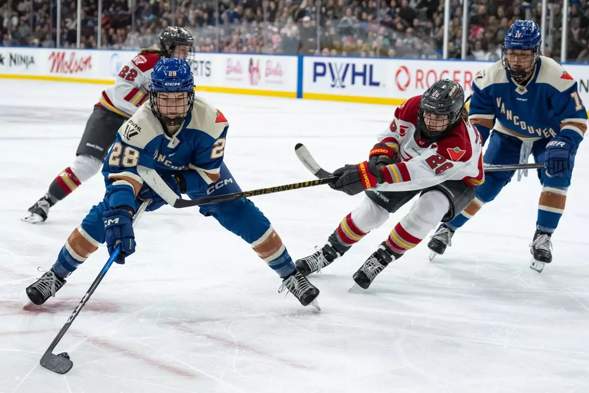 Vancouver Goldeneyes' Sydney Bard (11) and Ottawa Charge's Katerina Mrazova (16) vie for the puck during the third period of a PWHL hockey game in Vancouver, British Columbia, Saturday, March 14, 2026. (Ethan Cairns/The Canadian Press via AP)