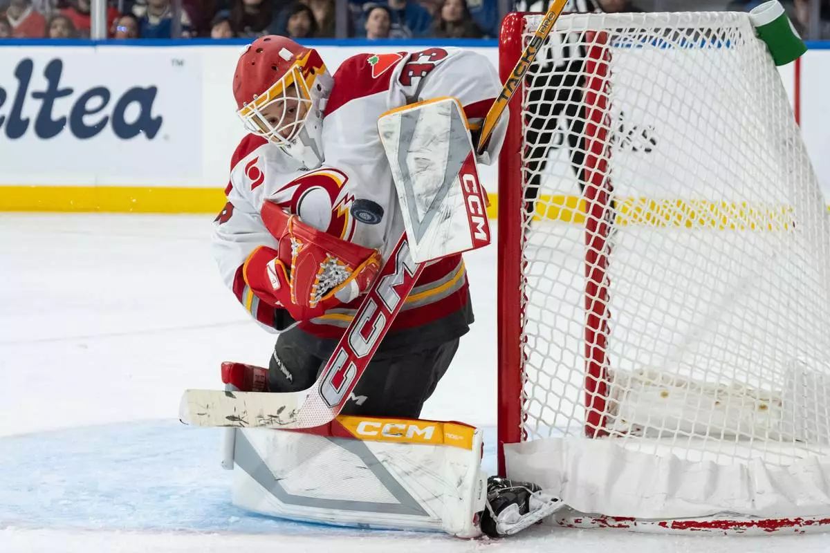 Ottawa Charge goaltender Gwyneth Philips (33) stops the puck against the Vancouver Goldeneyes during the third period of a PWHL hockey game in Vancouver, British Columbia, Saturday, March 14, 2026. (Ethan Cairns/The Canadian Press via AP)