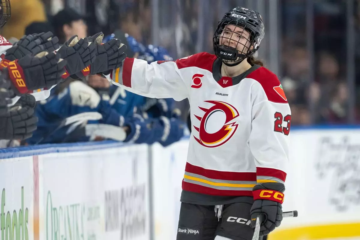 Ottawa Charge's Sarah Wozniewicz (23) celebrates her goal against the Vancouver Goldeneyes with her teammates during the third period of a PWHL hockey game in Vancouver, British Columbia, Saturday, March 14, 2026. (Ethan Cairns/The Canadian Press via AP)