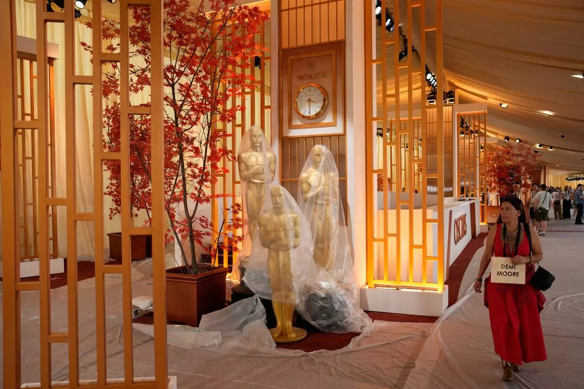 A person walks past Oscar statues wrapped in plastic in the red carpet area of the Dolby Theatre in Los Angeles, Friday, March 13, 2026, during preparations for Sunday's 98th Academy Awards ceremony. (AP Photo/John Locher)