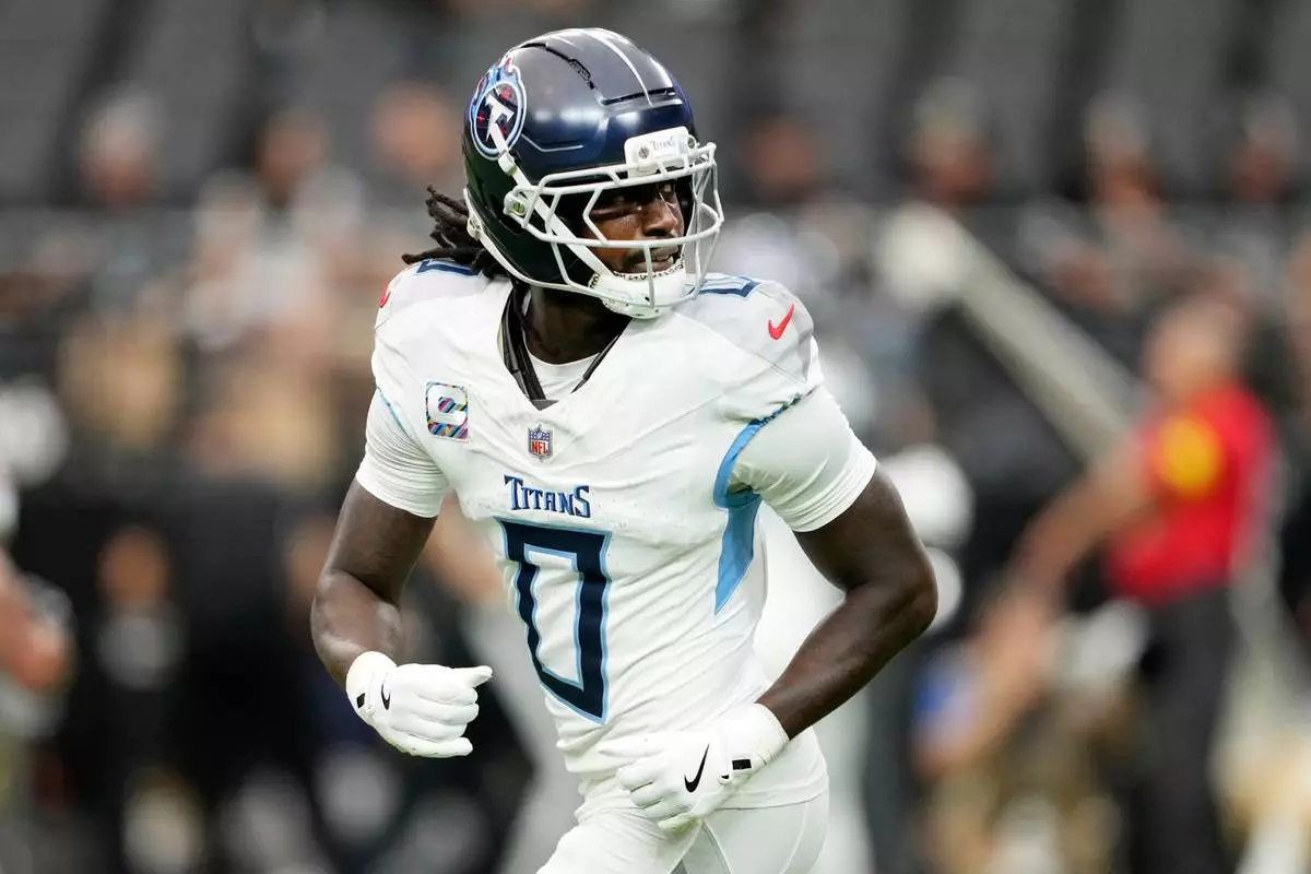 FILE - Tennessee Titans Calvin Ridley warms up before an NFL football game against the Las Vegas Raiders, Oct. 12, 2025, in Las Vegas. (AP Photo/Rick Scuteri, File)