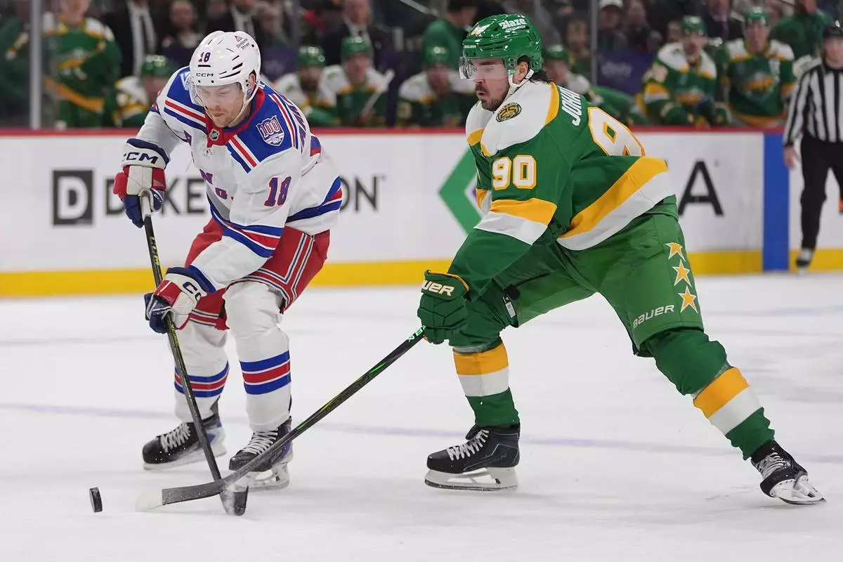 New York Rangers defenseman Urho Vaakanainen (18) and Minnesota Wild left wing Marcus Johansson (90) reach for the puck during the first period of an NHL hockey game, Saturday, March 14, 2026, in St. Paul, Minn. (AP Photo/Abbie Parr)