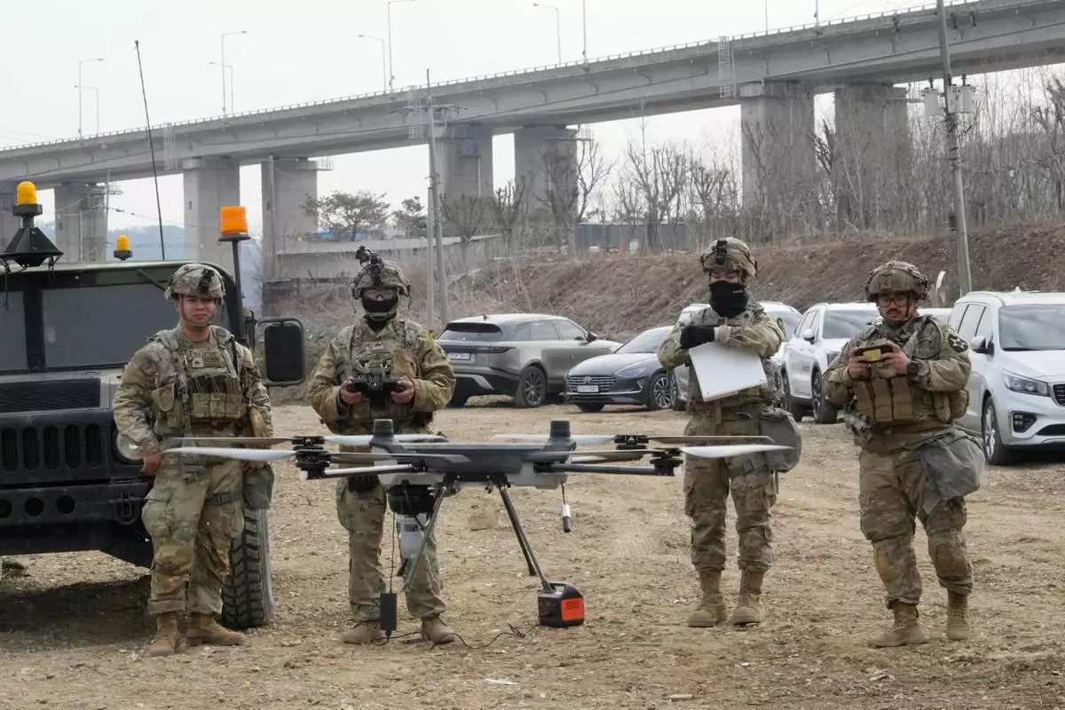U.S. Army soldiers operate their drone during a joint river-crossing exercise between South Korea and the United States as a part of the Freedom Shield military exercise in Yeoncheon, South Korea, Saturday, March 14, 2026. (AP Photo/Ahn Young-joon)