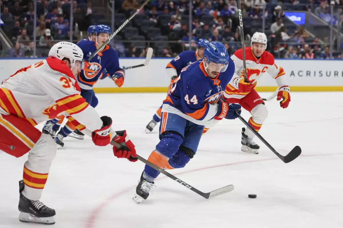 New York Islanders center Jean-Gabriel Pageau (44) takes the puck from Calgary Flames defenseman Yan Kuznetsov, left, during the first period of an NHL hockey game, Saturday, March 14, 2026, in Elmont, N.Y. (AP Photo/Heather Khalifa)