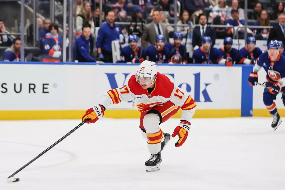 Calgary Flames center Yegor Sharangovich (17) reaches for the puck during the first period of an NHL hockey game against the New York Islanders, Saturday, March 14, 2026, in Elmont, N.Y. (AP Photo/Heather Khalifa)