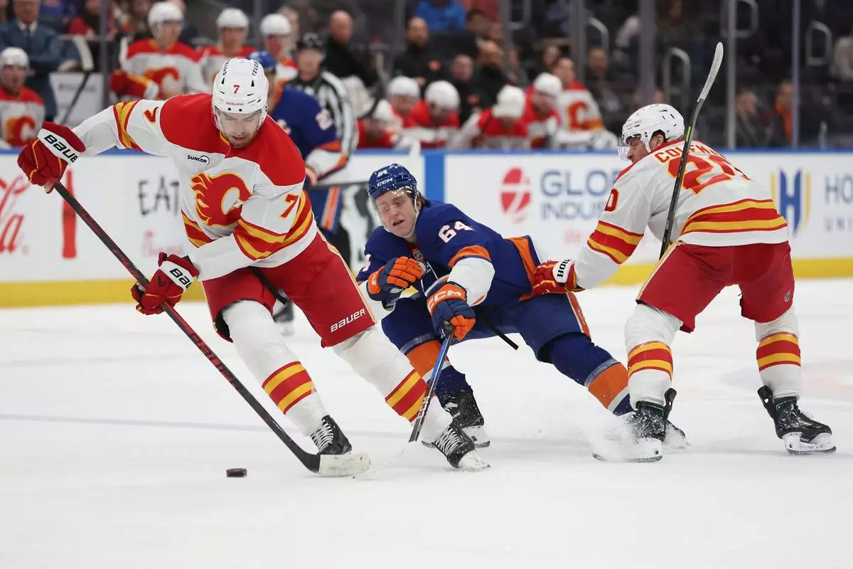 Calgary Flames defenseman Kevin Bahl (7) keeps the puck away from New York Islanders center Calum Ritchie (64) during the second period of an NHL hockey game, Saturday, March 14, 2026, in Elmont, N.Y. (AP Photo/Heather Khalifa)