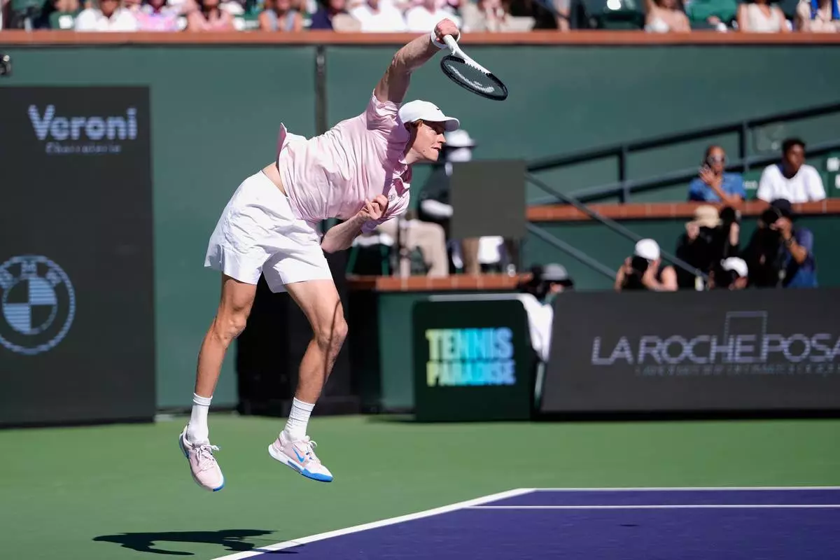 Jannik Sinner, of Italy, serves against Alexander Zverev, of Germany, during a semifinal match at the BNP Paribas Open tennis tournament, Saturday, March 14, 2026, in Indian Wells, Calif. (AP Photo/Mark J. Terrill)