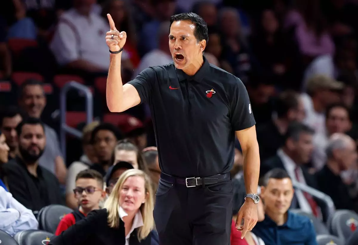 Miami Heat head coach Erik Spoelstra gestures during the first half of an NBA basketball game against the Orlando Magic in Miami, Saturday, March 14, 2026. (AP Photo/Rhona Wise)