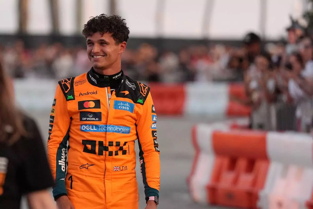 McLaren driver Lando Norris of Britain smiles toward fans after driving an MCL60 during a fan event showcasing past McLaren cars, ahead of the Formula One Miami Grand Prix auto race, Wednesday, April 29, 2026, in the Coconut Grove area of Miami. (AP Photo/Rebecca Blackwell)