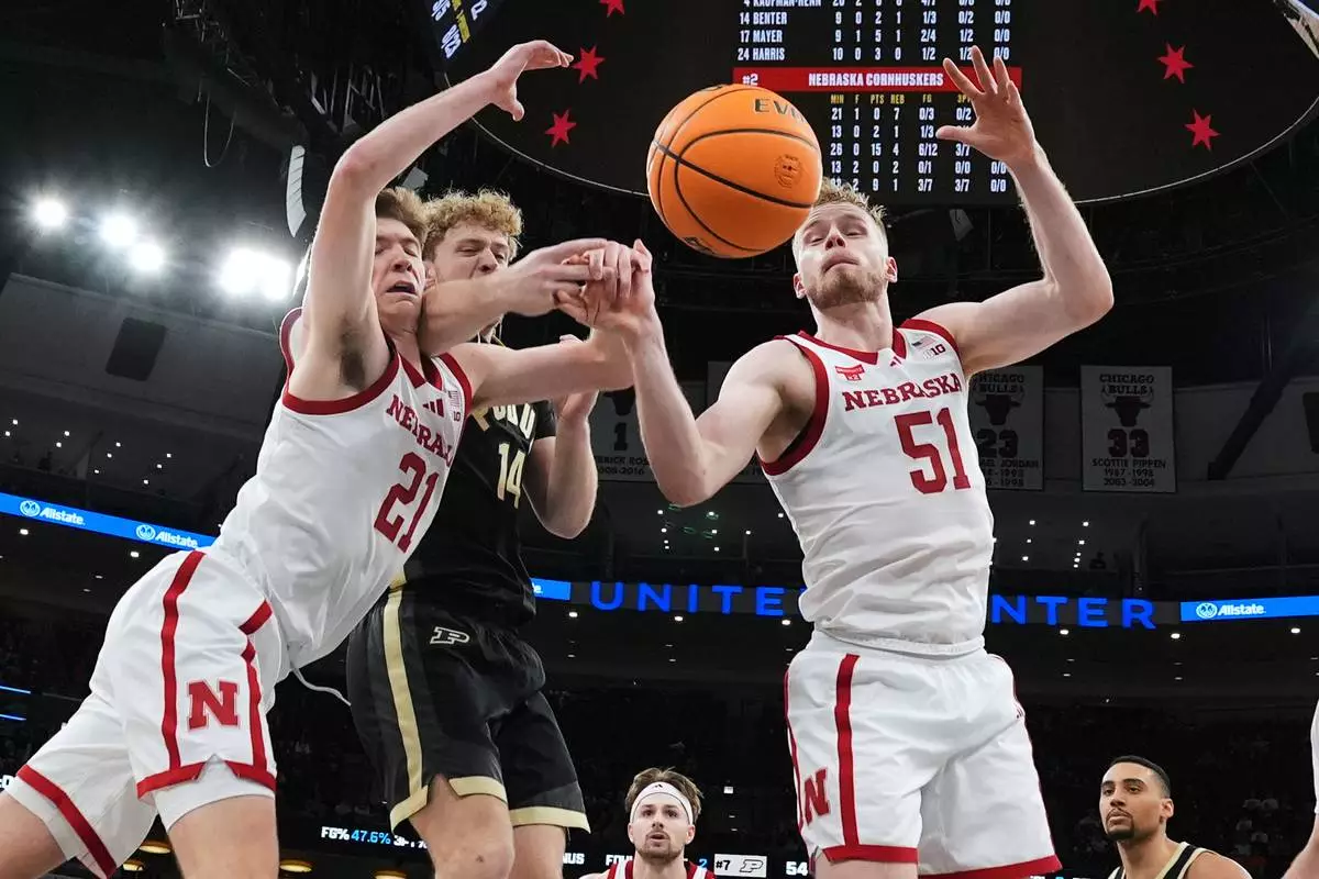 Purdue guard Jack Benter (14) battles for a rebound against Nebraska forwards Pryce Sandfort, left, and Rienk Mast (51) during the second half of an NCAA college basketball game in the quarterfinals of the Big 10 Conference tournament, Friday, March 13, 2026, in Chicago. (AP Photo/Nam Y. Huh)