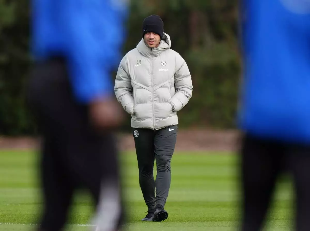 Chelsea's manager Liam Rosenior during a training session in Stoke d'Abernon, England, Monday March 16, 2026, ahead of the Champions League soccer match against Paris Saint-Germain. (Ben Whitley/PA via AP)