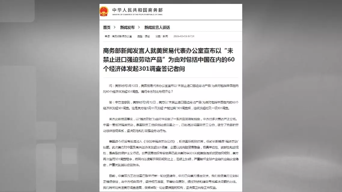 China has noted that on March 12 local time, the United States launched the new Section 301 trade investigation against the 60 economies on the grounds of "failing to prohibit the import of products made with forced labor," which came just one day after it launched another Section 301 trade investigation into 16 economies, including China, citing "overcapacity", a spokesperson from the ministry said.