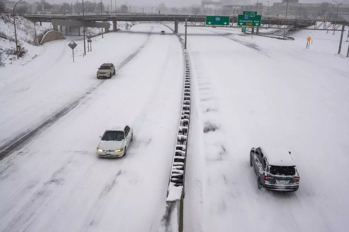 People drive on a snow-covered freeway during a snow storm Sunday, March 15, 2026, in Minneapolis. (Richard Tsong-Taatarii/Minnesota Star Tribune via AP)