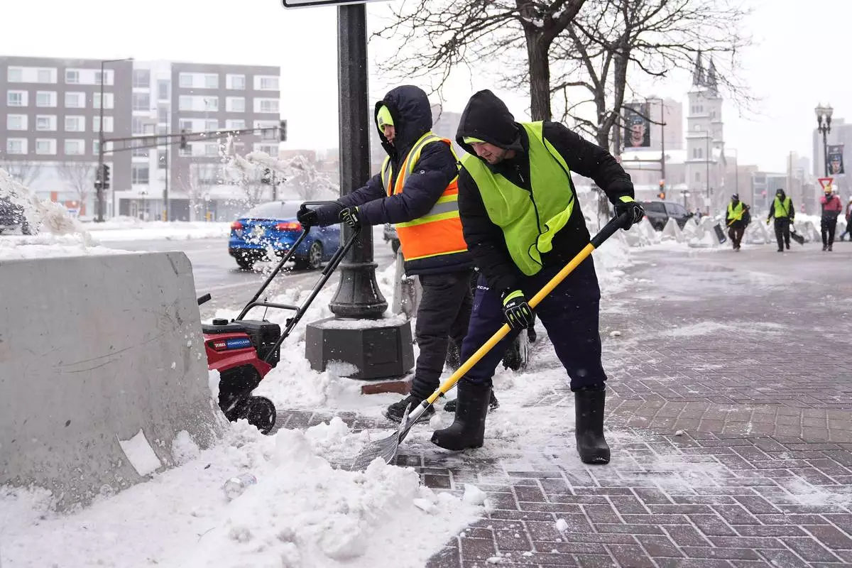 Workers clear snow off the ground Sunday, March 15, 2026, in St. Paul, Minn. (AP Photo/Abbie Parr)