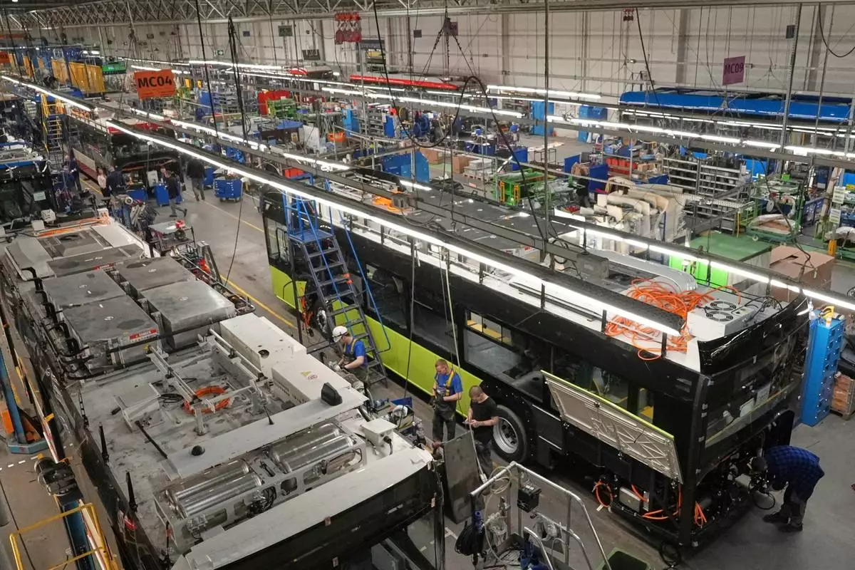 Workers build electric buses at the Solaris bus factory in Poznan, Poland, Thursday, Jan. 29, 2026. (AP Photo/Pietro De Cristofaro)