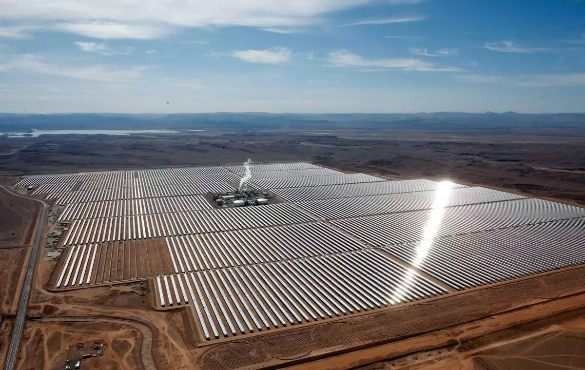 FILE - An aerial view of a solar power plant in Ouarzazate, central Morocco on Feb.4, 2016. (AP Photo/Abdeljalil Bounhar, File)