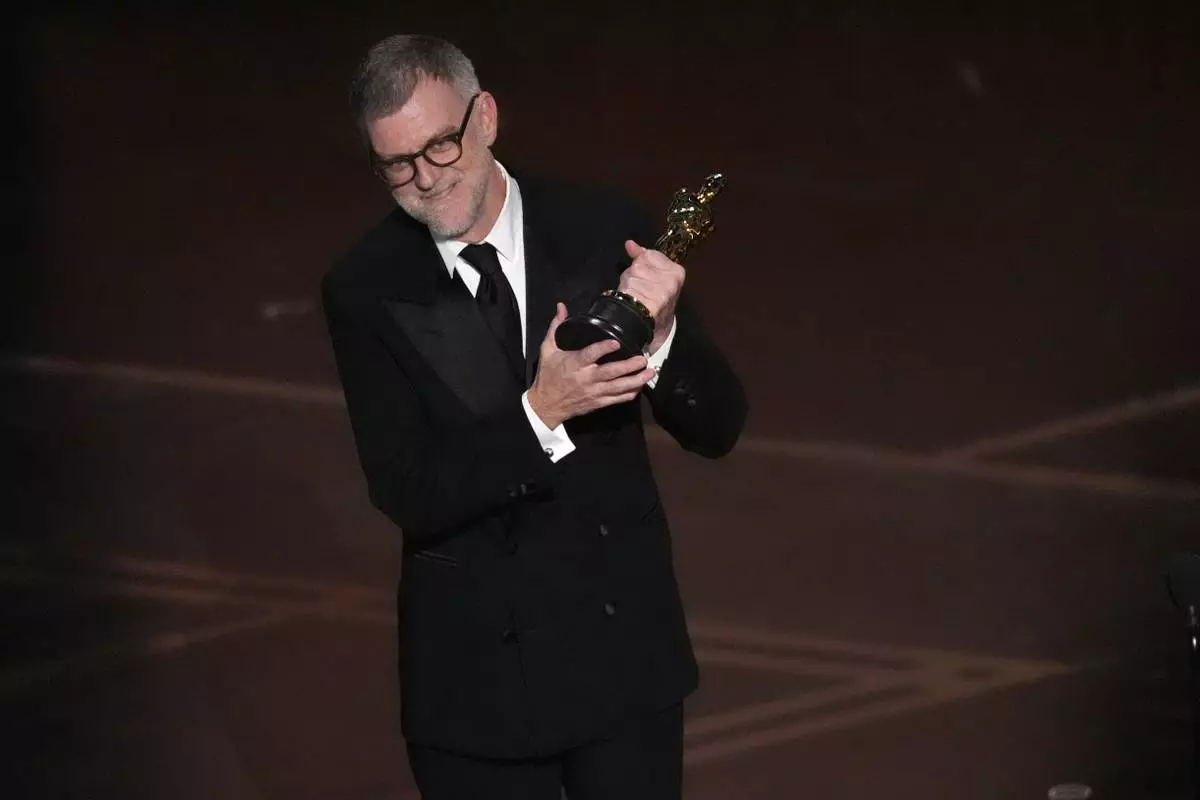 Paul Thomas Anderson accepts the award for directing for "One Battle After Another" during the Oscars on Sunday, March 15, 2026, at the Dolby Theatre in Los Angeles. (AP Photo/Chris Pizzello)