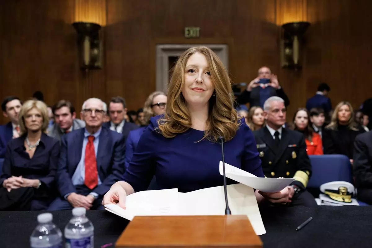 FILE - Dr. Casey Means takes her seat at the start of a Senate Health, Education Labor and Pension Committee confirmation hearing for U.S. Surgeon General on Capitol Hill, Feb. 25, 2026, in Washington. (AP Photo/Tom Brenner, File)