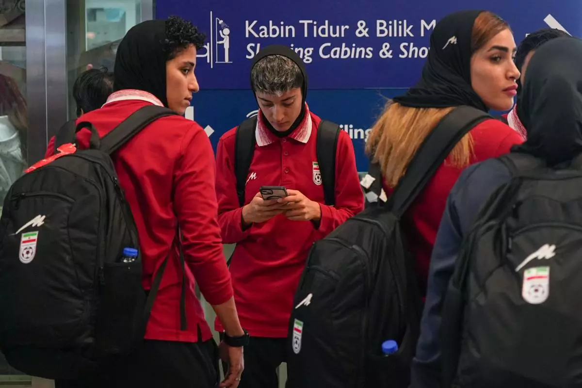 Members of Iran's women's football team arrive at the Kuala Lumpur International Airport in Sepang, Malaysia, Monday, March 16, 2026. (AP Photo/Azneal Ishak)