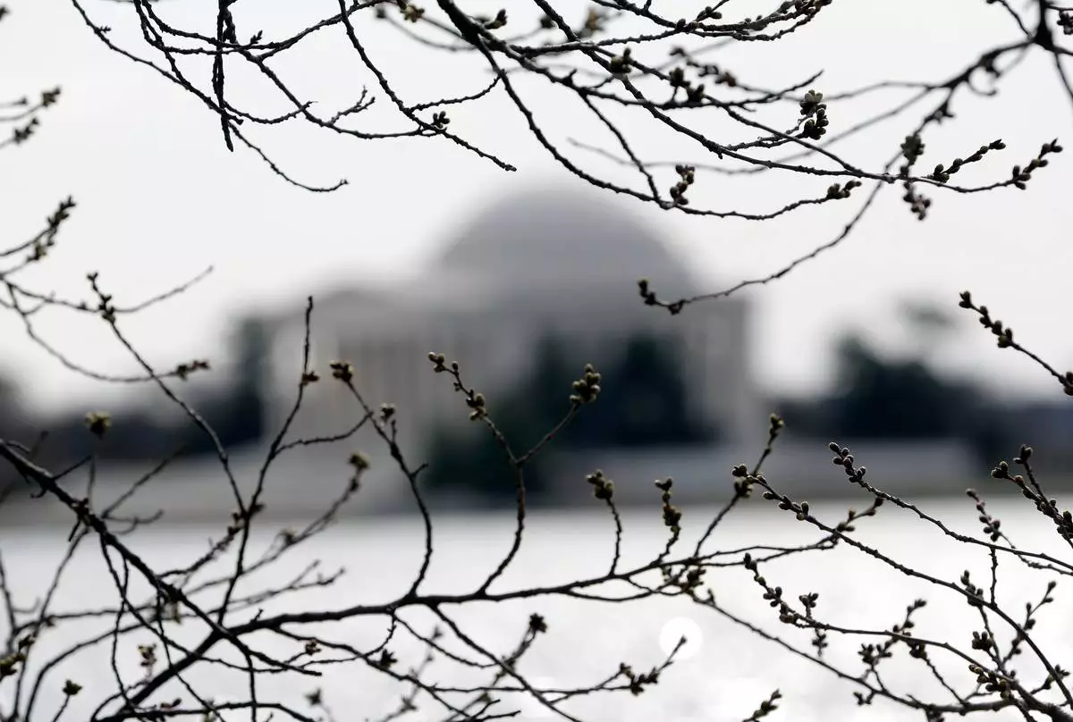 Cherry trees begin to bloom near the Jefferson Memorial, Friday, March 13, 2026, at the Tidal Basin in Washington. (AP Photo/Rahmat Gul)
