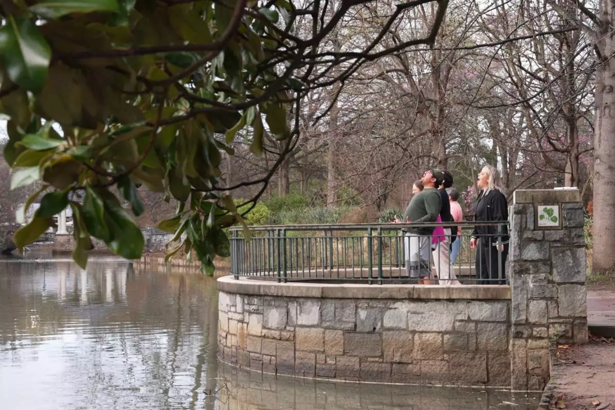 Fernando Coria and Sarah Woolson look at the skyline after screaming in Piedmont Park, Sunday, March 8, 2026, in Atlanta. (AP Photo/Emilie Megnien)