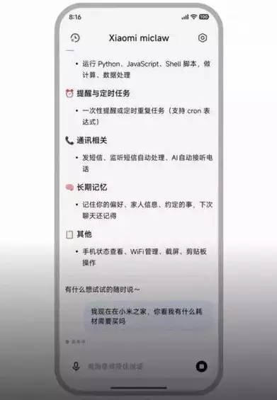 Xiaomi launched a small-scale closed test of its OpenClaw-like mobile system-level intelligent agent, "Xiaomi miclaw". Photo source: Demo image of Xiaomi miclaw