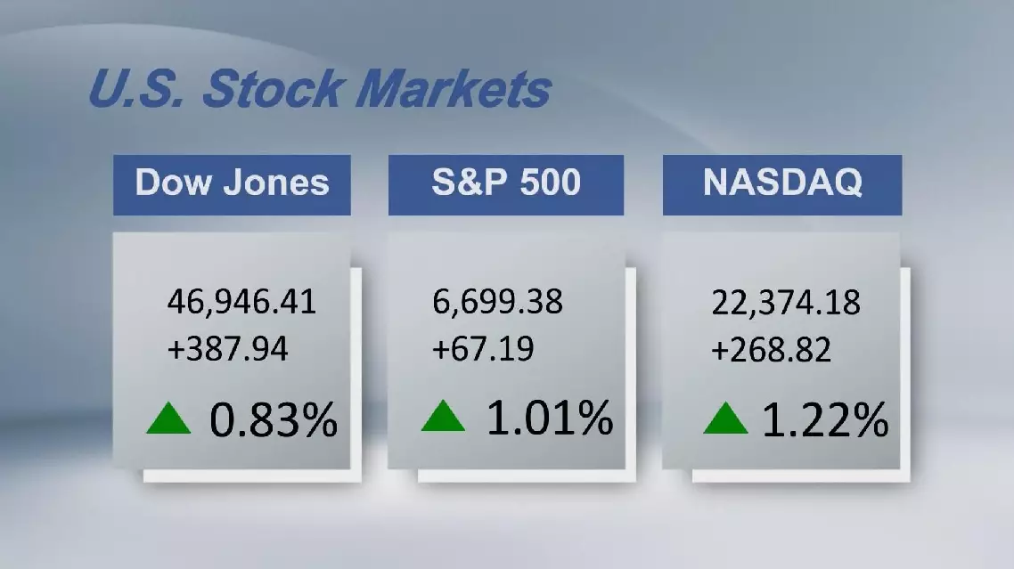 U.S. stocks ended higher on Monday as a pullback in oil prices and renewed strength in the technology sector lifted broader market sentiment. The Dow Jones Industrial Average rose 0.83 percent to 46,946.41. The S and P 500 added 1.01 percent to 6,699.38. The Nasdaq Composite Index increased 1.22 percent to 22,374.18.