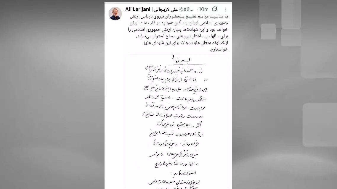 Iranian media on Tuesday released a handwritten condolence letter from Ali Larijani, secretary of Iran's Supreme National Security Council, addressed to fallen naval soldiers.