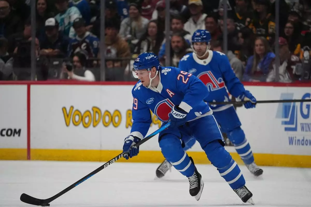 Colorado Avalanche center Nathan MacKinnon (29) collects the puck in the second period of an NHL hockey game against the Pittsburgh Penguins, Monday, March 16, 2026, in Denver. (AP Photo/David Zalubowski)