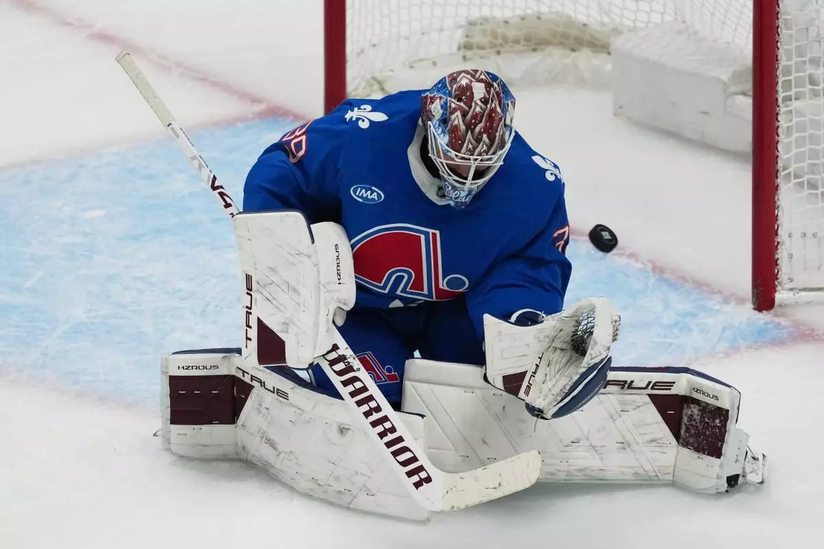 Colorado Avalanche goaltender MacKenzie Blackwood deflects a shot in the third period of an NHL hockey game against the Pittsburgh Penguins Monday, March 16, 2026, in Denver. (AP Photo/David Zalubowski)