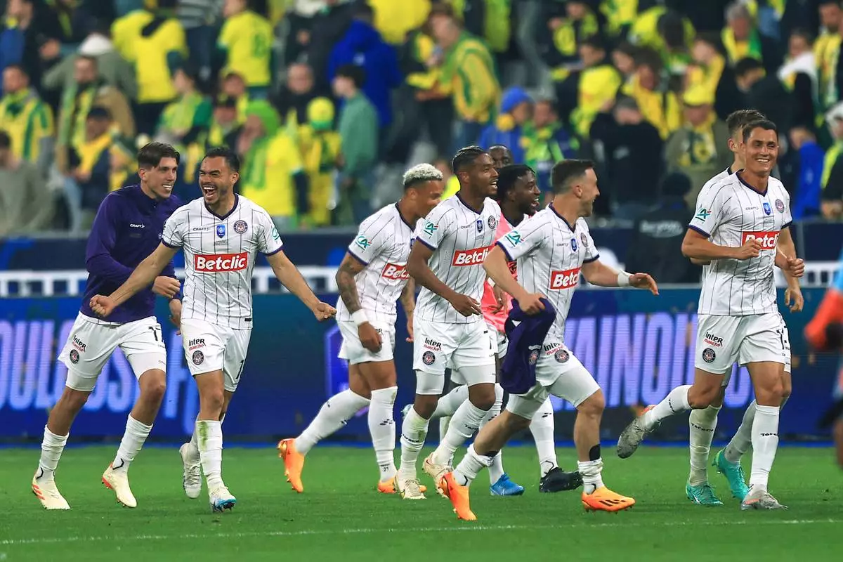 FILE - Toulouse players celebrate after winning the French Cup final soccer match between Nantes and Toulouse, at the Stade de France in Saint-Denis, outside Paris, April 29, 2023. (AP Photo/Aurelien Morissard, File)