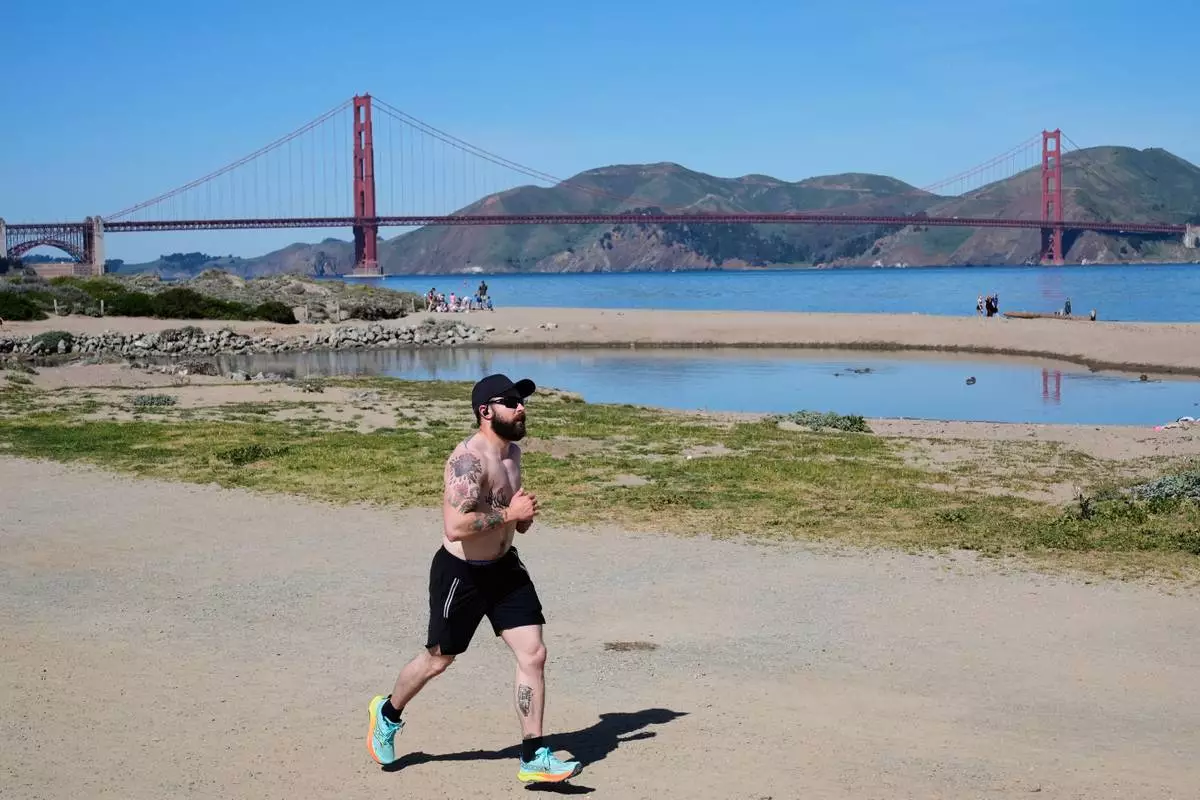 A man runs past at Crissy Field, backdropped by the Golden Gate Bridge in San Francisco, Tuesday, March 17, 2026. (AP Photo/Godofredo A. Vásquez)