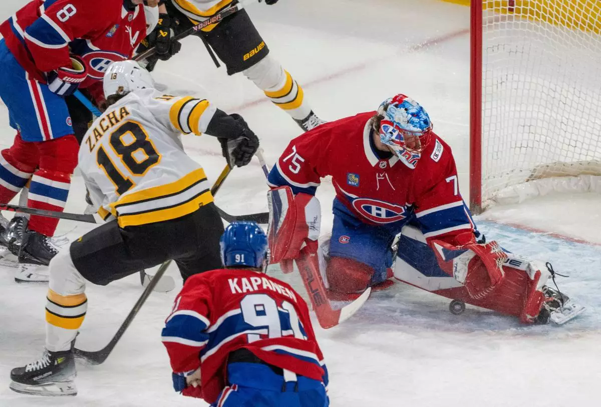 Montreal Canadiens goaltender Jakub Dobes (75) looks for the puck on a shot by Boston Bruins' Pavel Zacha (18) during the first period of an NHL hockey game in Montreal, Tuesday, March 17, 2026. (Christinne Muschi/The Canadian Press via AP)